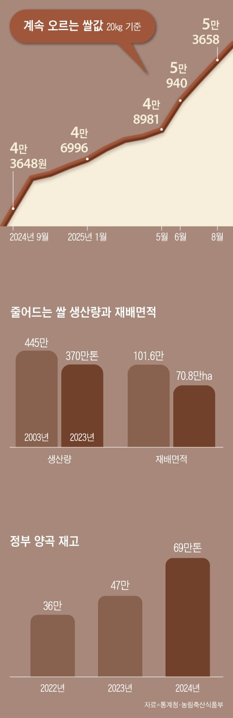 대한민국은 쌀이 남아돈다. 지난 1월 말 기준으로 정부 양곡 재고는 151만톤에 이른다. 적정 재고 80만톤을 한참 초과한다. 그런데 쌀 가격은 계속 오른다. 통계청 산지쌀값조사에 따르면 8월 중순 기준으로 20kg당 5만3658원을 기록했다. 1년 전 4만4157원과 비교하면 21.5% 올랐다. 2024년 11월 이후 쌀 가격은 지속적으로 상승했다. 이에 정부는 6월 11일 쌀 가격 안정 방안을 발표했지만 소용없었다. 정부는 8월 11일 정부 양곡 3만톤 대여 방침을 발표했다. 쌀을 받아간 업체는 2026년 3월까지 신곡으로 반납해야 한다. 농민 단체는 쌀 가격이 밥 한 공기당 300원이 되어야 한다고 주장한다. 밥 한 공기를 쌀 100g으로 잡으면 20kg당 6만원이다. 현재 가격보다 10% 이상 더 올라야 한다고 요구하는 것이다.